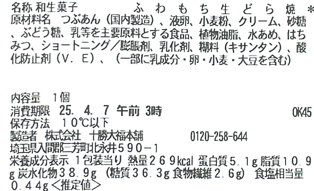 カロリー(熱量)は269kcal。消費期限は2025年4月4日購入時点で、2025年4月7日午前3時となっています。原材料はつぶあん(国内製造)・液卵・小麦粉などが記載されています。