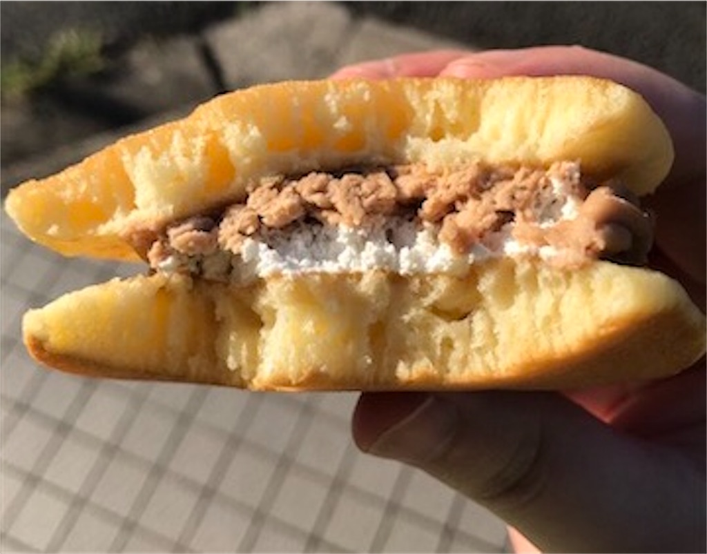 まず食感に関してだと、どらやき生地は通常のどら焼き生地と比べてパンケーキのようにふわっとした食感!!間に挟まれたホイップクリームは軽い口当たりで、マロンクリームはねっとりとなめらかな食感!!